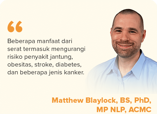 Meskipun telah diketahui bahwa serat memberikan berbagai manfaat terhadap kesehatan, kebanyakan orang masih belum dapat memenuhi kebutuhan untuk makanan berserat tinggi seperti sereal utuh, sayuran, dan buah-buahan dalam makanan sehari-hari mereka. Meningkatkan asupan serat dengan sengaja adalah salah satu kebiasaan yang akan membantu orang hidup sehat “. (Matthew-Blaylock-BS-PhD-MP-NLP-ACMC).